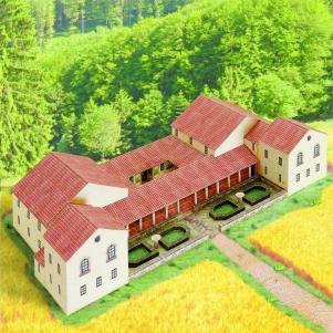 Bouwplaat Romeins Landgoed Villa Rustica. Kartonnen bouwplaat van 4 vellen. Afmeting 37x19x7 Schaal 1:87. Moeilijkheidsgraat 1. Leon Schuijt